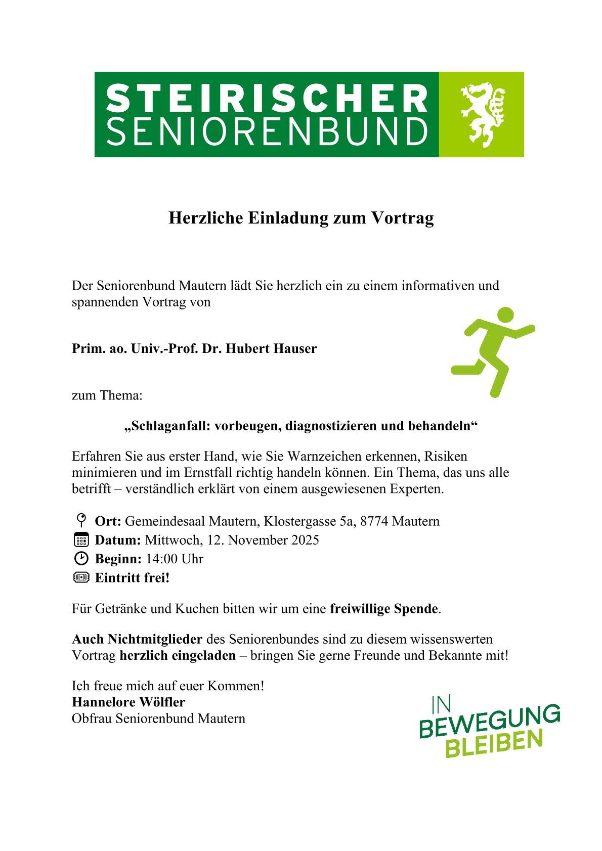 STEIRISCHER SENIORENBUND: VORTRAG "SCHLAGANFALL: VORBEUGEN, DIAGNOSTIZIEREN UND BEHANDELN"